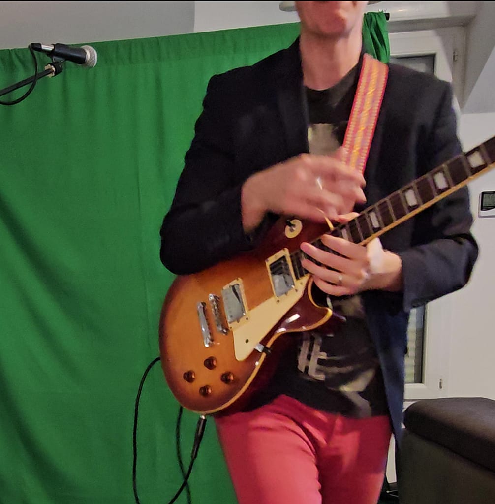 Tous les sons de guitare électique sont enregistrés avec cette épiphone Les Paul Classic Honeyburst. La guitare est branchée par prise jack sur l’interface audio « Focusrite 2i2 » reliée elle-même à l’ordinateur via USB.