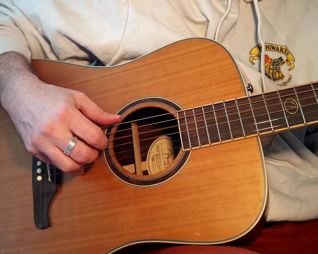 Les enregistrements « électro-accoustiques » sont réalisés avec une « CORT CJ-10X ». C’est une guitare « Jumbo » dont la prise de son s’effectue avec système d’amplification de chez « Fishman ». La guitare est branchée par prise jack sur l’interface audio « Focusrite 2i2 » reliée elle-même à l’ordinateur via USB.